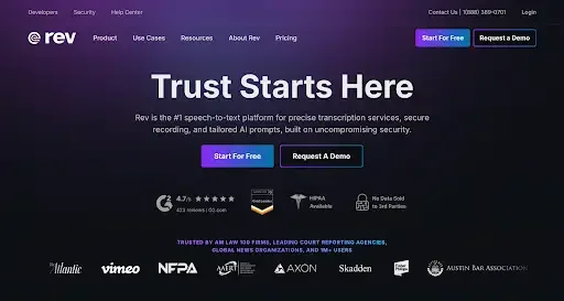Rev | 99% (AI & human) | HIPAA, enterprise-grade | Both | 37+ | AI: $0.25 / Human: $1.50 | Enterprises needing full compliance, security & team workflows |