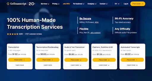 GoTranscript delivers enterprise-level transcription with outstanding accuracy and multilingual reach. The service combines human transcription with free proofreading, which explains why it consistently delivers up to 99.4% accuracy.