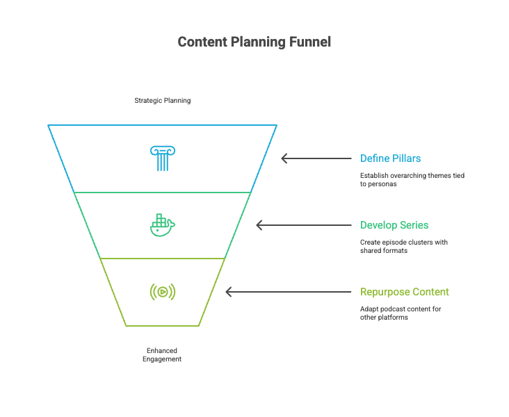 Once you’ve nailed down your personas, sales stages, and revenue goals, the next step is shaping your content calendar with pillars and series. This is where strategic planning meets creativity, and where your B2B podcast starts to feel like a real editorial engine.