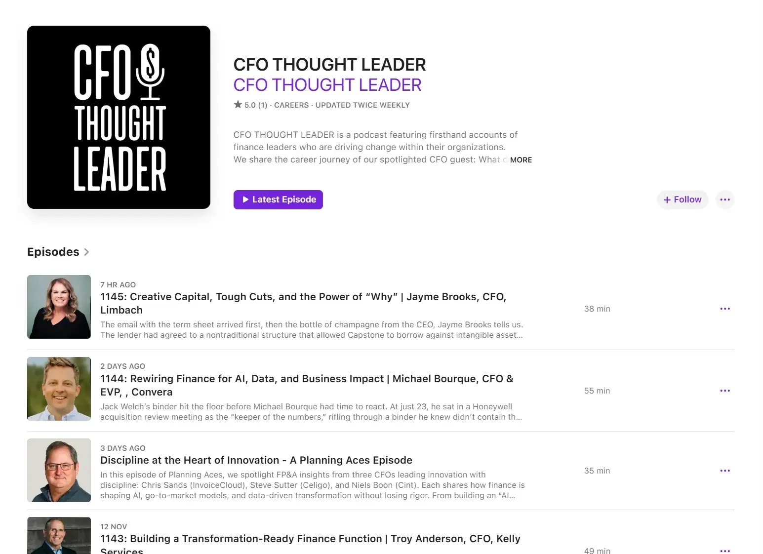 CFO Thought Leader has been a go-to podcast for finance professionals for years. It brings in-depth conversations with senior finance leaders who’ve done the job and lived to tell the tale. With over 1,100 episodes, it’s one of the most extensive podcast libraries focused squarely on the CFO journey.