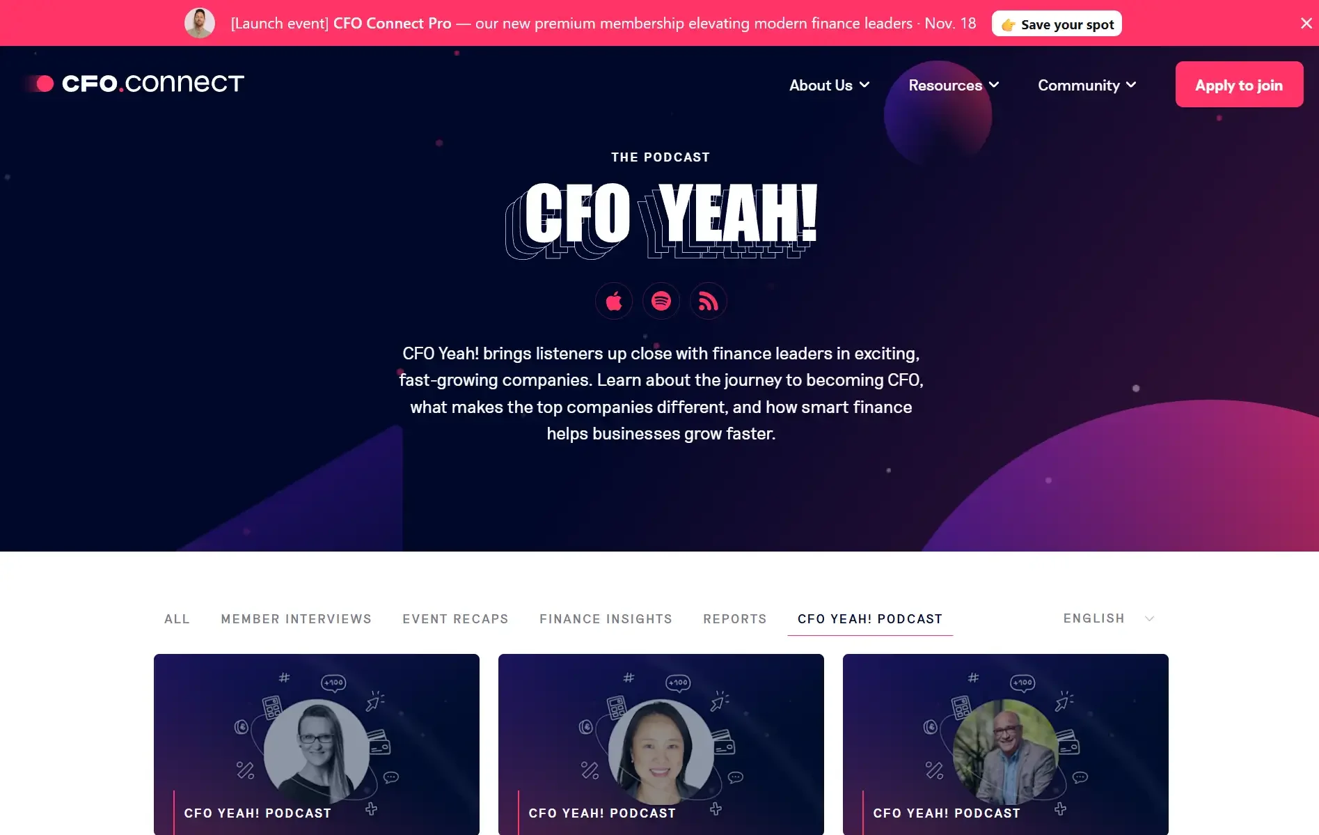 Hosted by the team at CFO Connect, the CFO Yeah! podcast zooms in on finance leaders working in fast‑growth companies, especially those dealing with scale, tech adoption, and business model shifts.
