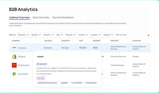 For external podcasts, we recommend setting up on a podcast hosting platform like CoHost so reporting is actionable. In addition to hosting your podcast, CoHost provides company and role-level insights, episode benchmarks, and attribution exports that your RevOps team can match in the CRM.