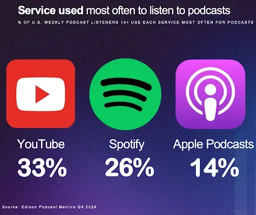 YouTube is the service used most often by weekly podcast listeners, which makes podcasts a natural fit for company channels and exec visibility.