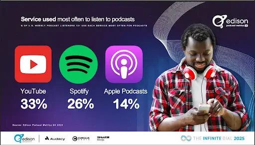 According to Edison’s Infinite Dial 2025, YouTube is the service most used for podcast listening, with 33% of weekly podcast listeners naming it their primary platform.
