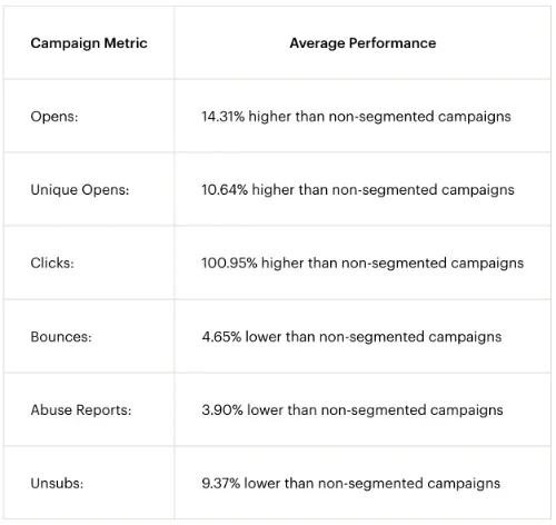 For example, Mailchimp’s analysis found segmented campaigns delivered 14.31% higher open rates and 100.95% higher click rates compared to non-segmented sends.