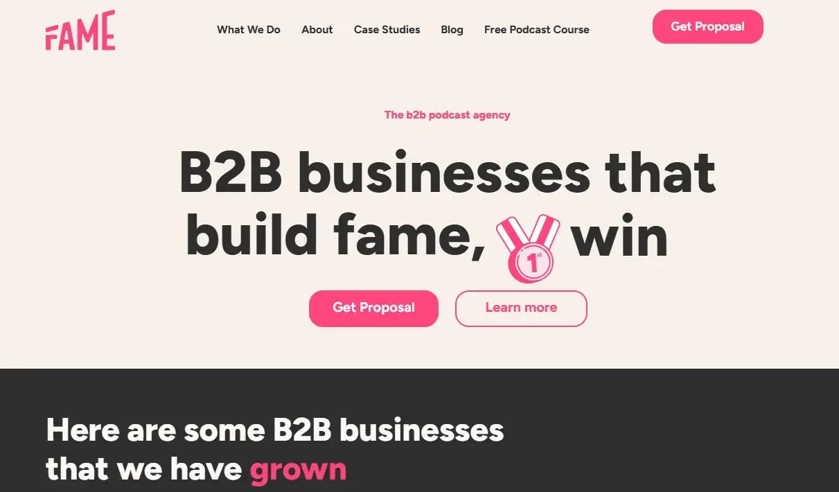 Fame: Globally distributed team focused solely on B2B podcasts, offering a unique download-growth guarantee and efficient end-to-end workflows.