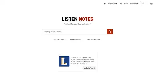 Listen Notes is a powerful search engine for podcasts with a large global database. B2B marketers often use it for research, competitive tracking, or audience discovery rather than in-depth analytics. While its data is less granular than enterprise analytics platforms, it is useful for identifying relevant podcasts in specific niches and monitoring industry activity.