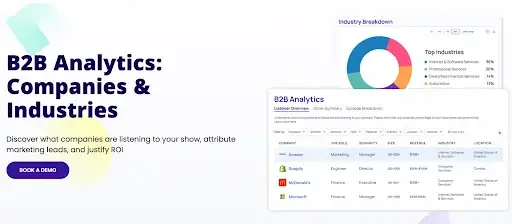 Its B2B Analytics identifies which companies are listening by size, industry, and revenue. This gives marketing teams visibility into pipeline-qualified accounts and helps prove how podcast engagement supports lead generation and deal velocity. Spotify Ad Analytics (formerly Podsights) complements this with ad-level attribution.