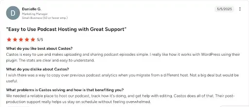 Support and community: Highly rated support (TrustPilot: 4.8/5 from 88 reviews; G2: 4.5/5) and active weekly Q&A sessions have earned praise for their responsiveness and creator-first approach. Here’s what the Podcast Consultant had to say: