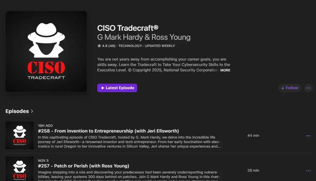 CISO Tradecraft is hosted by G. Mark Hardy and Ross Young, two well-respected voices in the cybersecurity leadership space, and teaches the business, strategy, and communication skills that separate top-tier CISOs from the rest. It’s all about helping you move from a security expert to a business leader who happens to specialize in security.