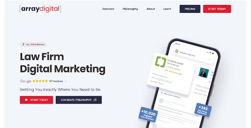 Array Digital, founded in 2017 and headquartered in Chesapeake, VA, specializes exclusively in law firm marketing. They offer SEO, PPC, website design, live chat, retargeting, content marketing, and full-service branding tailored to attorneys.