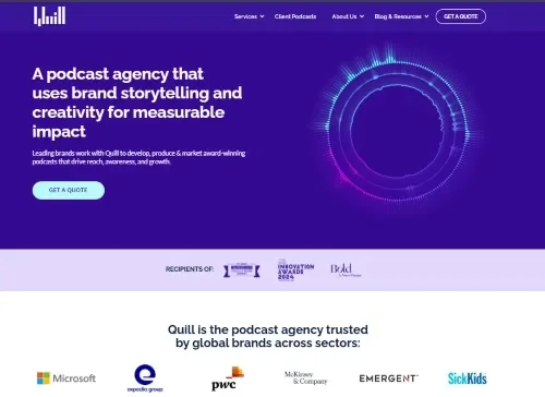 Quill supports branded shows for major companies like Expedia Group, PwC, Walmart, and BlackRock, as well as internal podcasts for employee engagement and leadership communication. Their flexibility across formats like audio, video, public, and private makes them a smart fit for companies scaling their content operations or modernizing executive visibility.